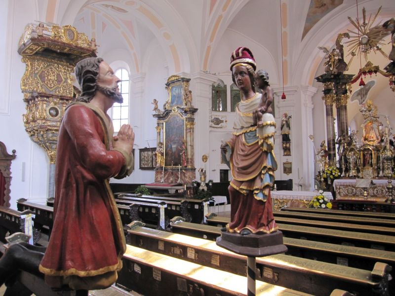 Das riesige Kirchenschiff ist ausgestattet mit dem Hochaltar (Augsburger Goldschmiedearbeit von 1750-1752), vier Seitenaltären, Betstühlen mit geschnitzten Rokokomuschelwerk und der Orgel (eine Stiftung der Kurfürstin Anna Maria).