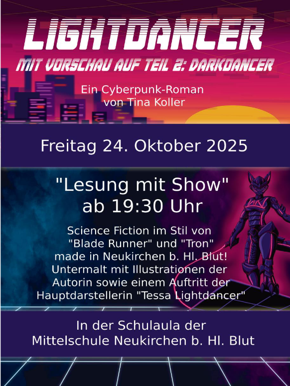 Am 24. Oktober findet in der Aula der Mittelschule eine „Lesung mit Show“ durch die Neukirchner Autorin Tina Koller statt.